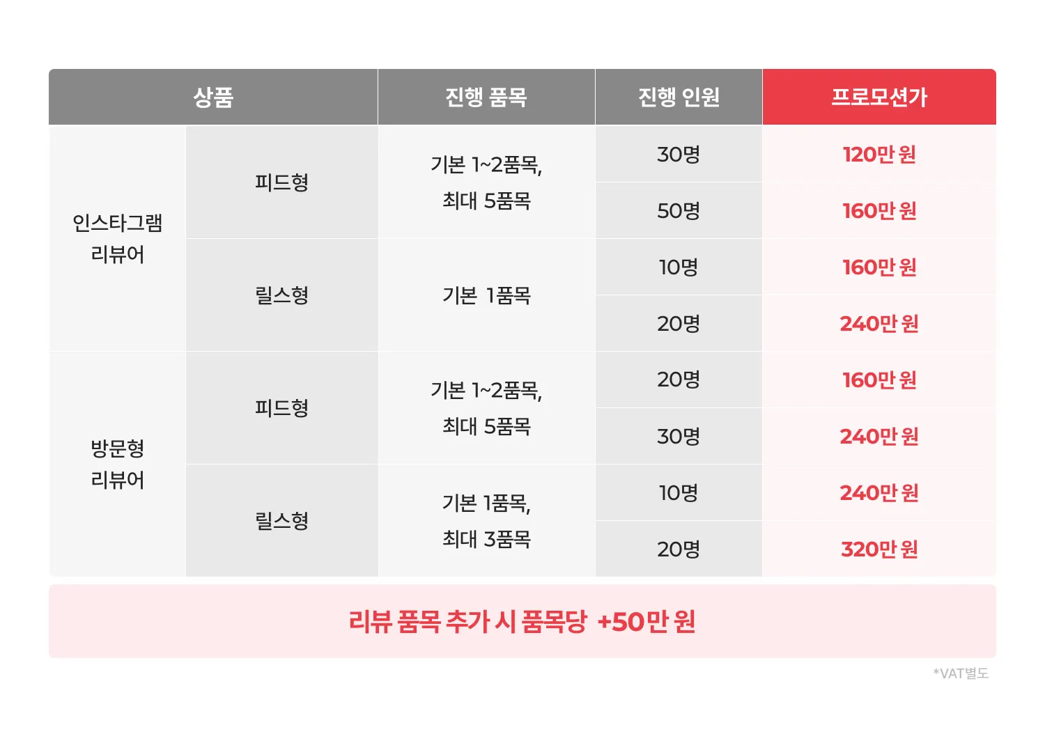 전체 타입에 할인이 적용되어, 원하는 타입과 인원에 맞춰 제약 없이 진행할 수 있어요.